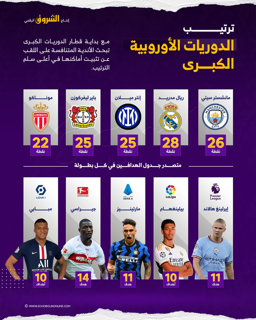ترتيب الدوريات الأوروبية الخمسة الكبرى، ومتصدري جدول الهدافين في كل بطولة..