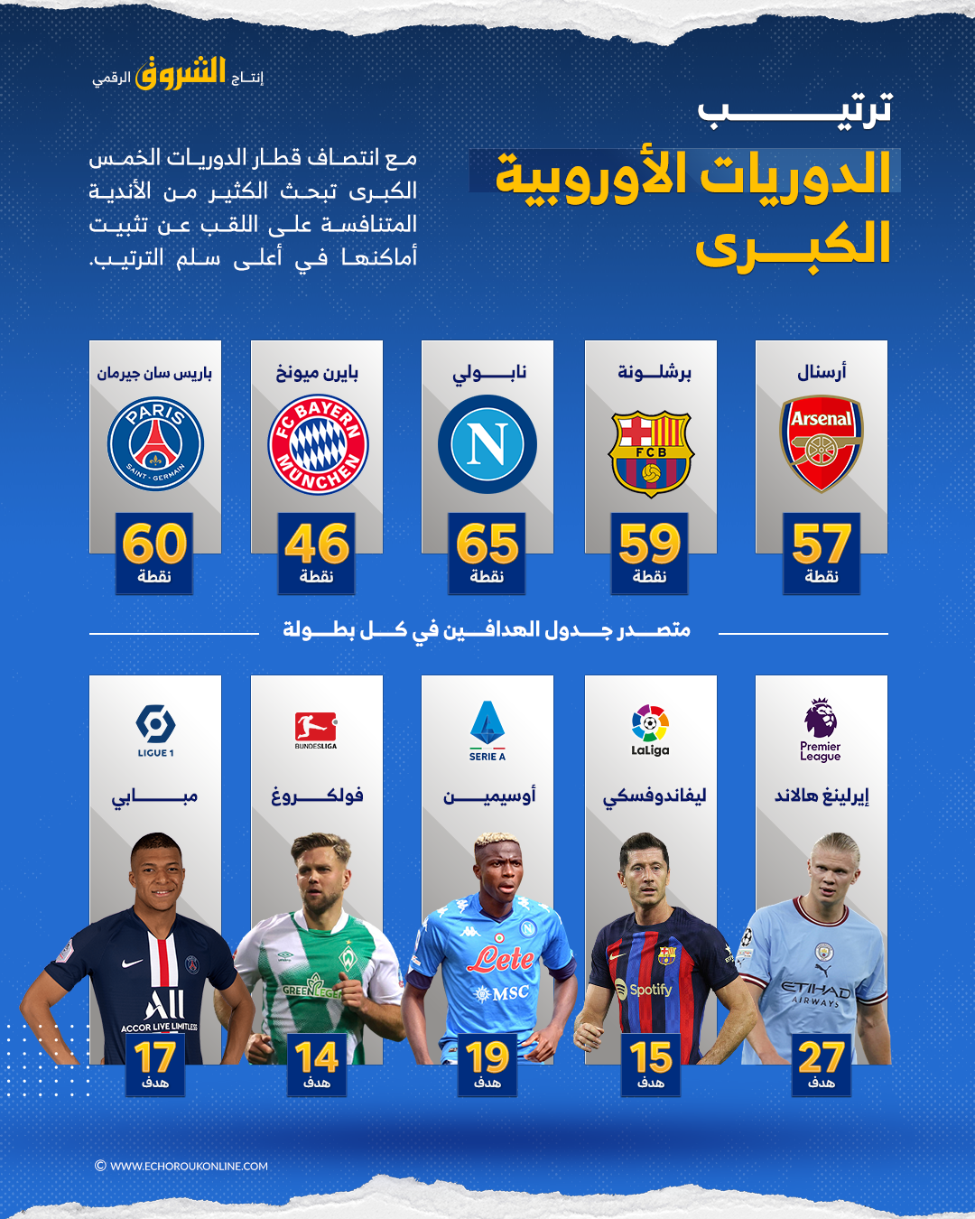 تعرف الدوريات الأوروبية في إيطاليا وإنجلترا وإسبانيا حالة مشتركة تمثلت في احتكار صدارة الترتيب وجائزة الهداف من قبل نابولي، سان جيرمان وبرشلونة..