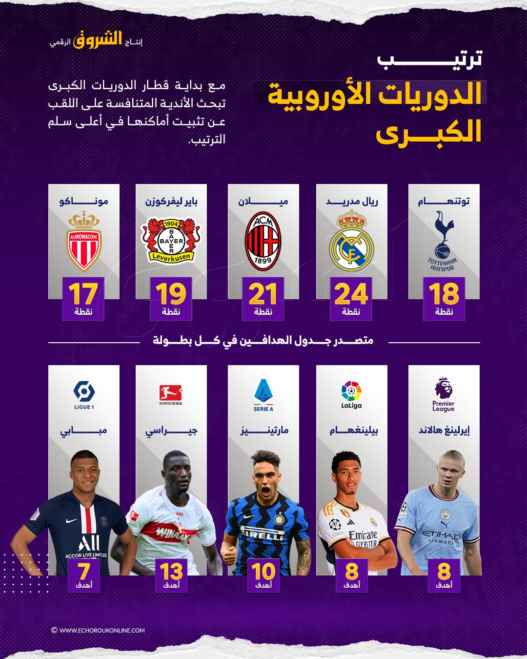 مع لعب عدة جولات في الدوريات الكبرى تستمر الأندية المتنافسة على اللقب عن تثبيت أماكنها في أعلى سلم الترتيب.. هذا هو ترتيب الدوريات الأوروبية الكبرى