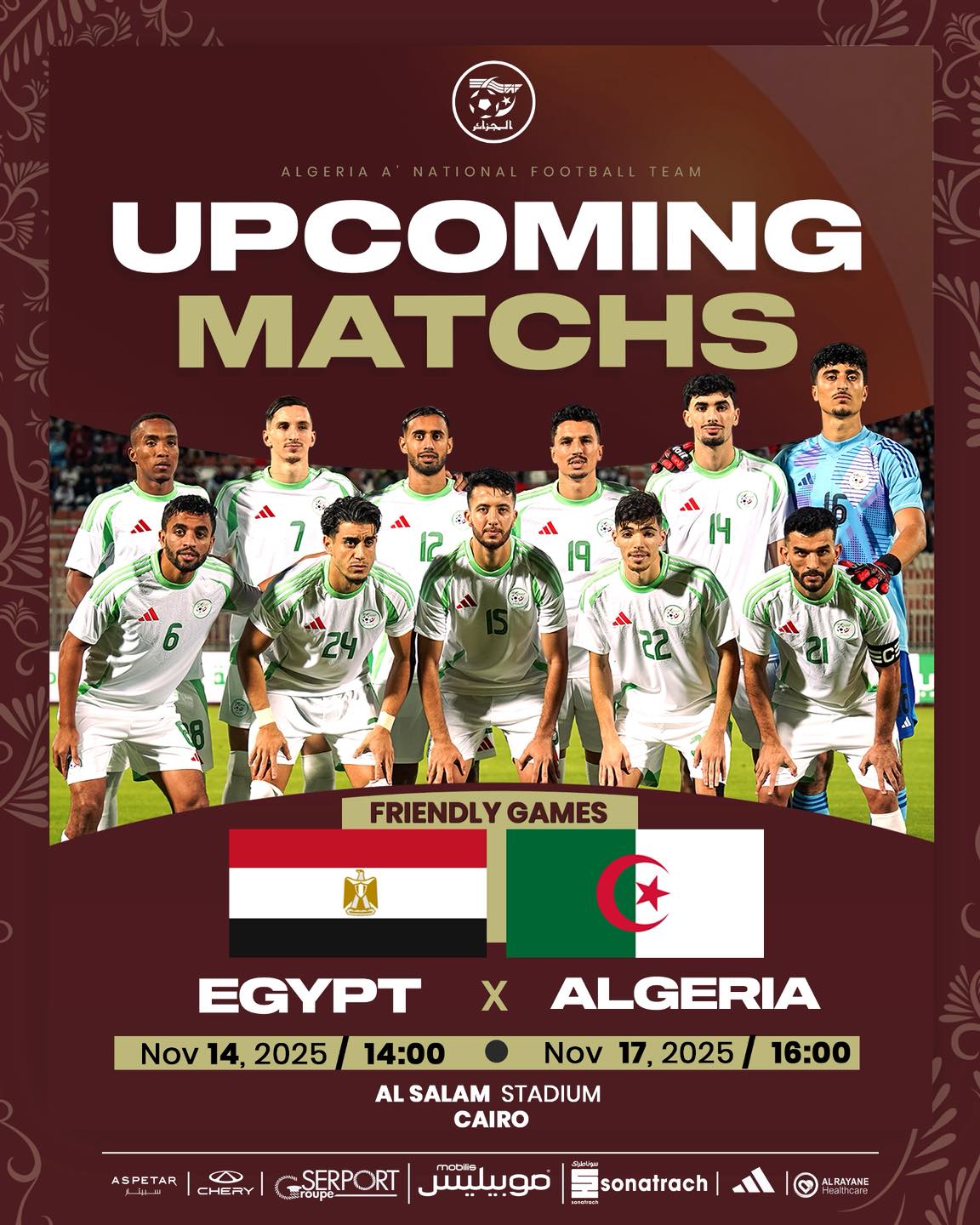 أعلن الاتحاد الجزائري لكرة القدم، عن خوض المنتخب الوطني للمحليين مبارتين وديتين أمام نظيره المصري، خلال شهر نوفمبر المقبل.