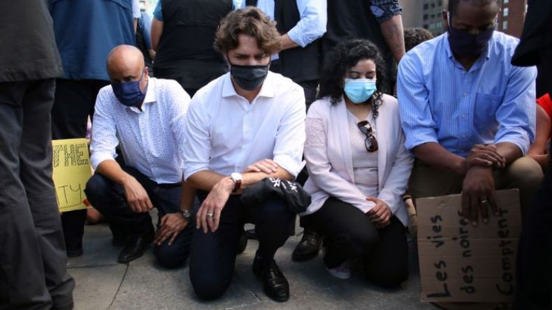 انضم رئيس الوزراء الكندي جاستن ترودو إلى آلاف المتظاهرين في أوتاوا، الجمعة، جاثياً على ركبته لمناهضة العنصرية وعنف الشرطة بعد وفاة جورج فلويد في الولايات المتحدة الأمريكية.