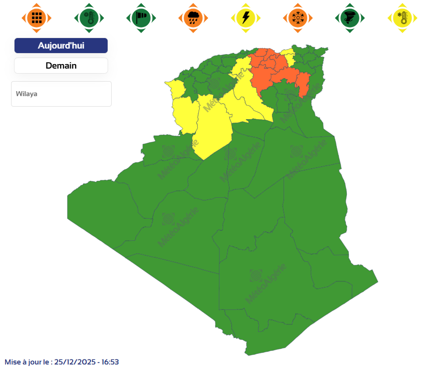 نبّهت نشرية خاصة لمصالح الأرصاد الجوية من تساقط ثلوج كثيفة يومي الخميس والجمعة، يصل سمكها إلى 15 سنتيمتر، بعدّة ولايات من وسط وشرق البلاد.