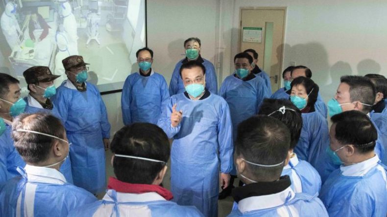 رئيس مجلس الوزراء الصيني لي كيكيانغ (وسط) يتحدث مع العاملين الطبيين في مستشفى ووهان جينينتان بمدينة ووهان في مقاطعة هوبي وسط الصين يوم 27 جانفي 2020