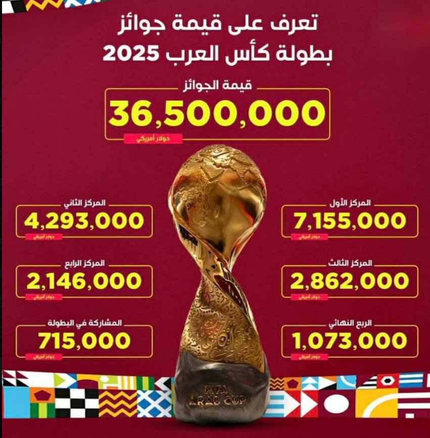 ويبلغ مجموع جوائز كأس العرب 36.500.000 دولار.