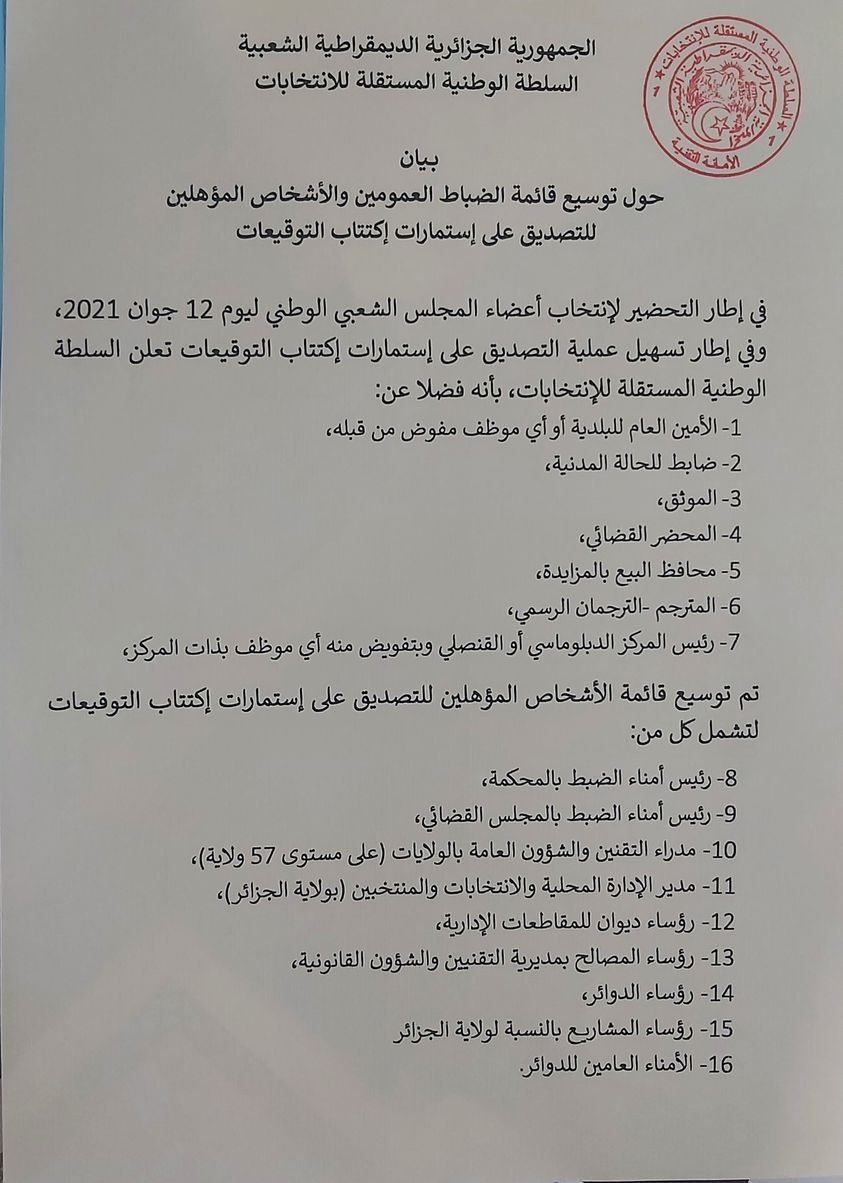 وجاء في بيان نشرته السلطة “في إطار التحضير لانتخابات أعضاء المجلس الشعبي الوطني ليوم 12 جوان 2021 وفي إطار تسهيل عملية التصديق على استمارات اكتتاب التوقيعات تعلن السلطة الوطنية المستقلة للانتخابات بأنه تم توسيع قائمة الأشخاص المؤهلين للتصديق على استمارات اكتتاب التوقيعات لتشمل: