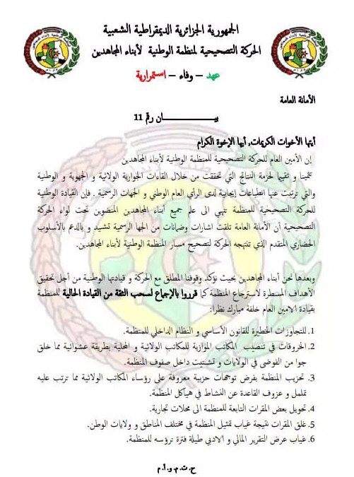 وقال البيان على لسان أمين عام التصحيحية، طارق عباوي، أن القيادة الحالية للمنظمة الوطنيه لأبناء المجاهدين، قد تسيست وأصبحت لسان ناطق أحزاب معينة، وذلك بفرض توجيهات حزبية معروفة على رؤساء المكاتب الولائية، مضيفا في الوقت ذاته، ان بعض المقرات التابعة للمنظمة قد تحولت إلى محلات تجارية وبعض قد تم بيعه بطرق ملتوية ومشبوهة، والبعض الآخر قد تم غلقها نتيجة غياب تمثيل المنظمة في عدة مناطق من الوطن.