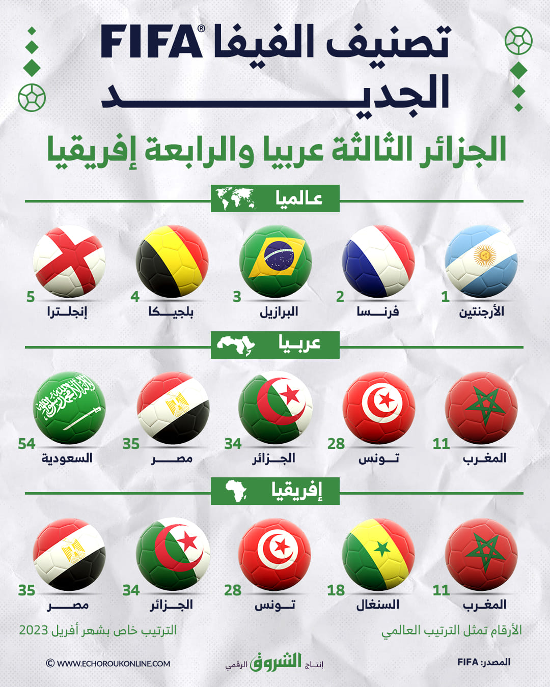 الجزائر الثالثة عربياً والرابعة إفريقيا.. هذا هو تصنيف الاتحاد الدولي لكرة القدم (فيفا) الجديد..