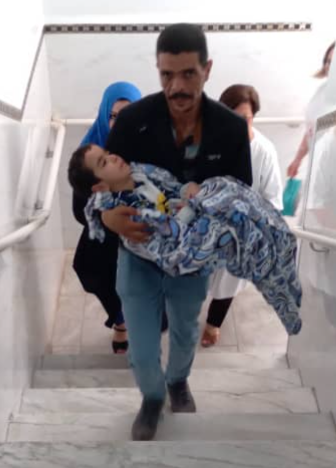 وناشد والد الطفل السلطات لمساعدته من أجل علاجه في الخارج لأنه عاطل عن العمل، لديه 4 أطفال، ويسكن في الطابق الرابع ويجد مشقة كبيرة في حمله يوميا للعلاج، كما باع كل ما يملك في رحلة تشخيص حالته.