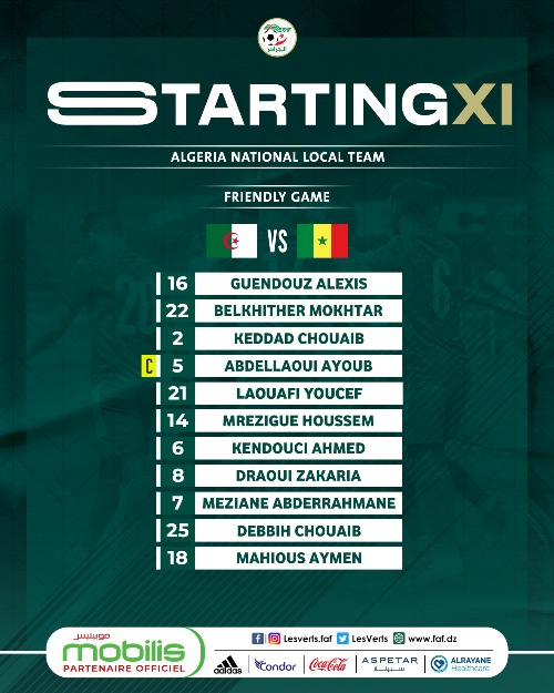 وسجّل ثنائية منتخب “الخضر” للمحلّيين كلّ من: متوسّط ميدان وفاق سطيف أحمد كندوسي في الدقيقة الـ 27، ومهاجم اتحاد العاصمة أيمن محيوس في الدقيقة الـ 61.
