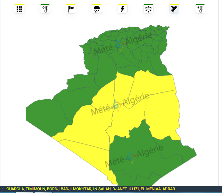 وحسب تنبيه باللون الأصفر لمصالح الأرصاد الجوية، فإن الولايات المعنية هي: سوق أهراس، تيميمون، غرداية، بني عباس، تيارت، بسكرة، ولاد جلال، بشار.