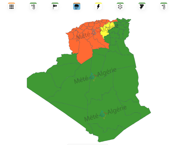 كما نبهت المصالح ذاتها في نشرية من المستوى الثاني باللون البرتقالي من تساقط أمطار غزيرة تكون رعدية أحيانا على ولايات: بشار، البيض، الجلفة والأغواط