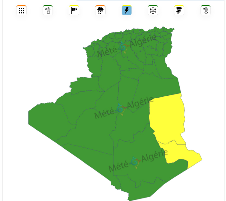 وستكون الولايات المعنية هي: سكيكدة، عنابة، الطارف، قالمة وسوق أهراس، وستمتد صلاحية هذه النشرية إلى غاية منتصف نهار  الإثنين.
