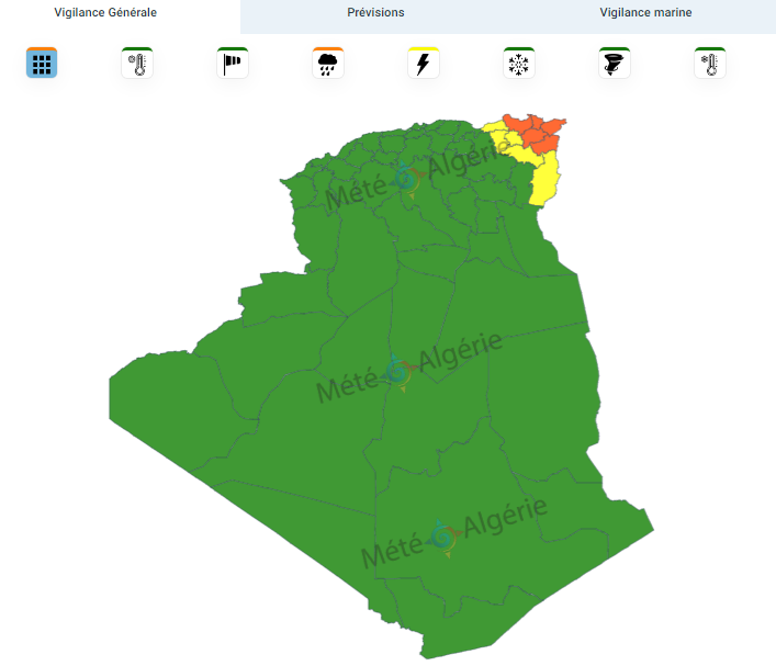 نبهت نشرية خاصة بالحالة الجوية، صبيحة الأحد، من استمرار تساقط الأمطار الرعدية عبر 17 ولاية منها 7 في المستوى البرتقالي.