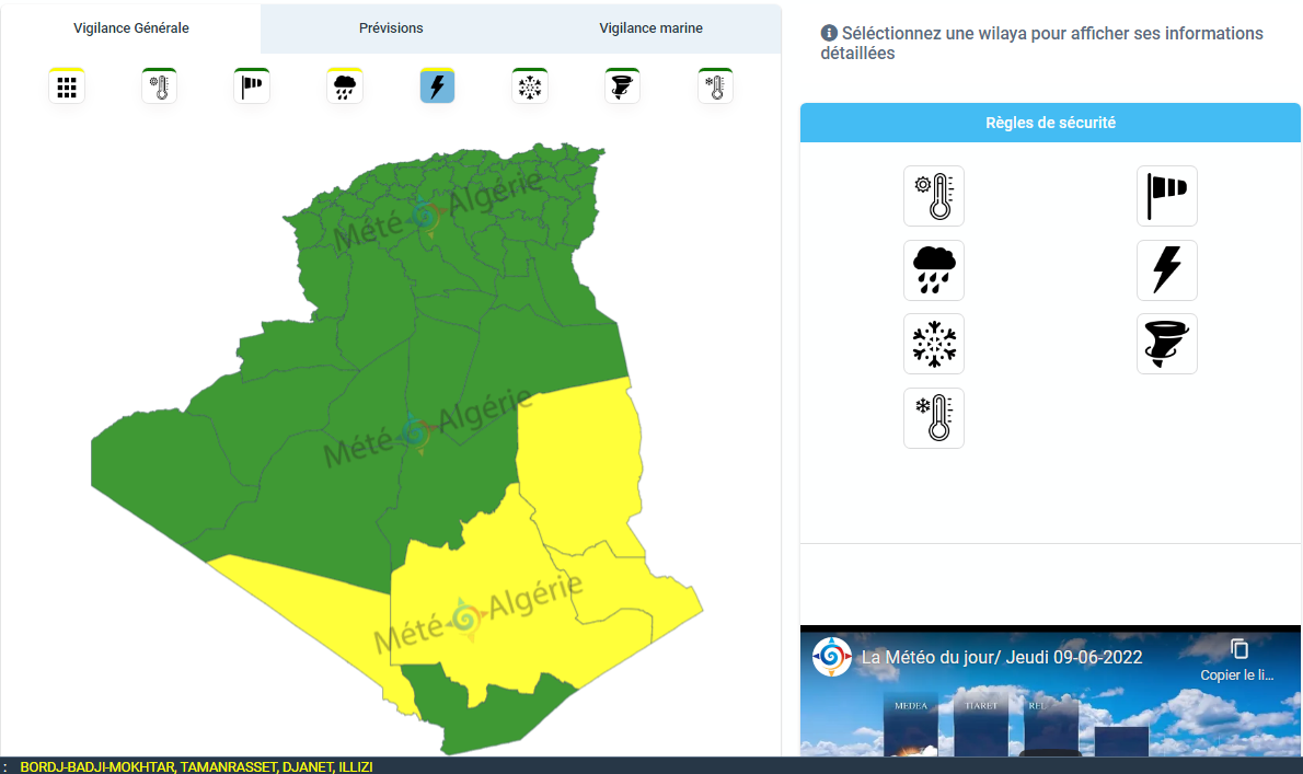 وحسب تنبيه من المستوى الأول جاء باللون الأصفر فإن الولايات المعنية بالنشرية هي: برج باجي مختار، تمنراست، جانت وإليزي.