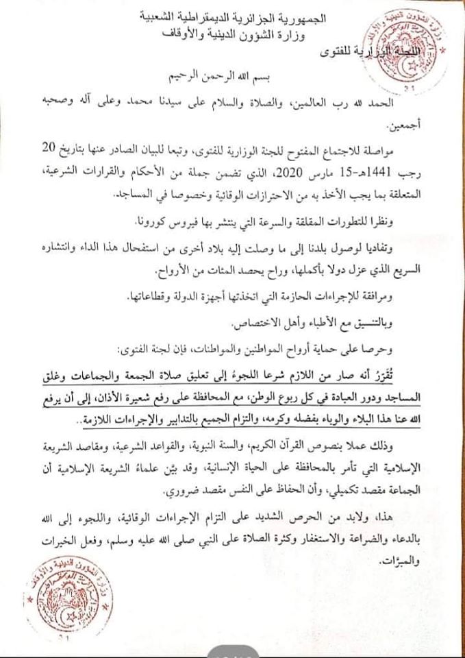 وتأتي تصريحات الوزير، بناء على قرار لجنة الفتوى بوزارة الشؤون الدينية والأوقاف التي أصدرت بيانا وضحت فيه أسباب تعليق الصلاة في جميع المساجد نظرا للتطورات المقلقة والسرعة التي ينتشر بها فيروس كورونا، حيث جاء فيه “مرافقة للإجراءات الحازمة التي اتخذتها الدولة وقطاعاتها وبالتنسيق مع الأطباء وأهل الاختصاص، فإن لجنة الفتوى قررت بأنه من اللازم شرعا اللجوء إلى تعليق صلاة الجمعة والجماعات وغلق المساجد ودور العبادة في كل ربوع الوطن مع المحافظة على رفع شعيرة الأذان إلى أن يرفع الله عنا هذا البلاء والوباء وكرمه والتزام الجميع بالتدابير والإجراءات اللازمة”.