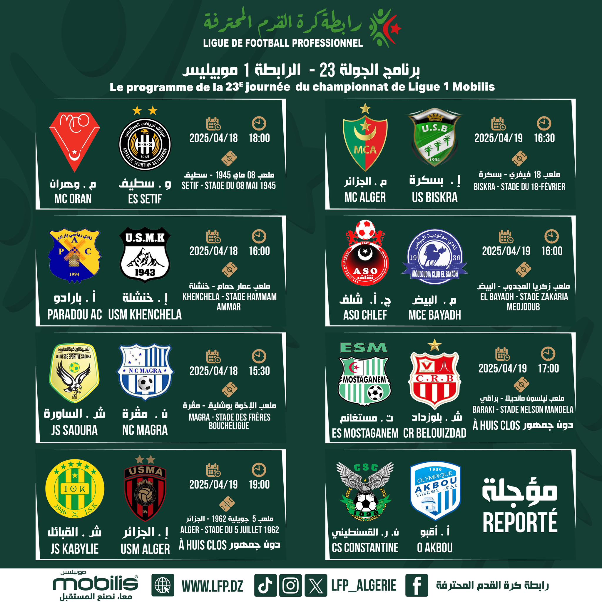 وأجلت مباراة أولمبيك أقبو وشباب قسنطينة، بسبب خوض شباب قسنطينة مباراة ذهاب نصف نهائي كأس “الكاف”، الأحد المقبل، أمام نهضة بركان المغربي.