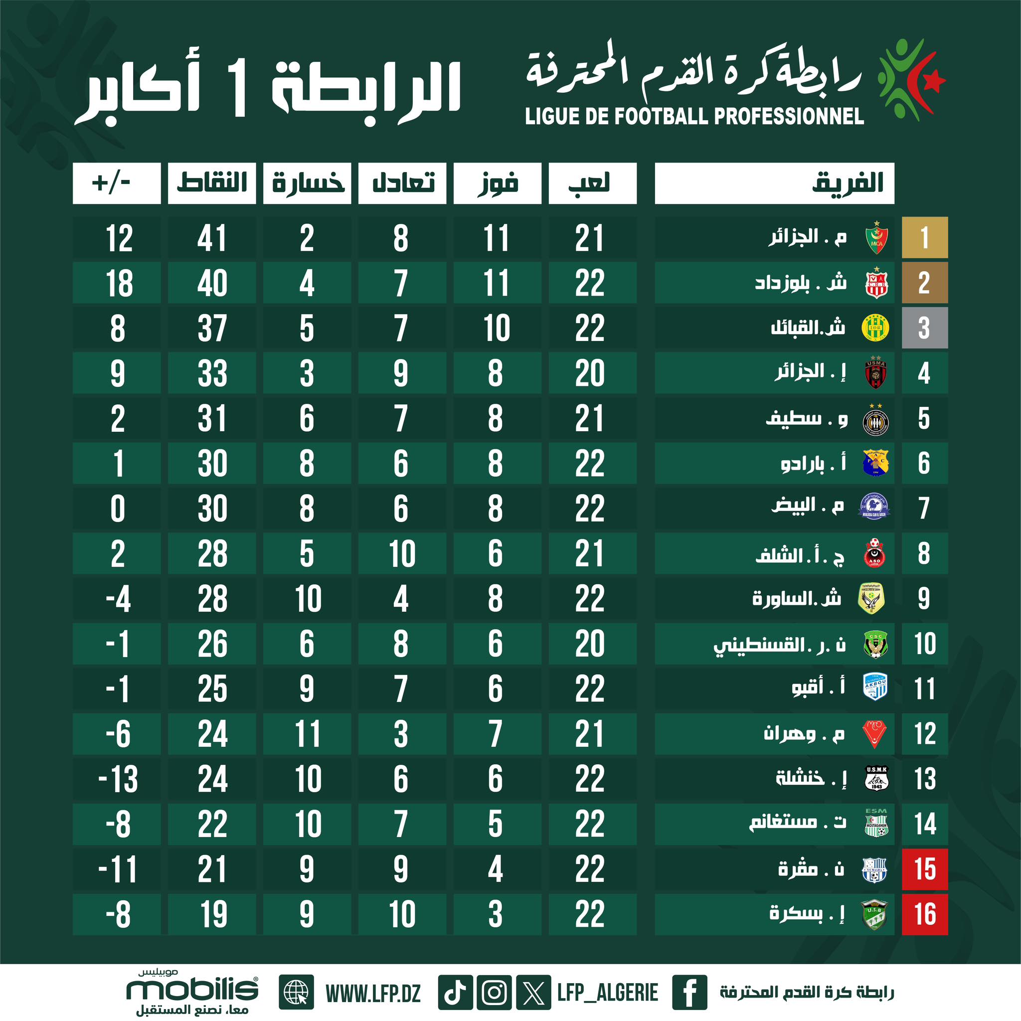 ويتصدر فريق مولودية الجزائر جدول ترتيب الرابطة المحترفة الأولى برصيد41 نقطة، مع مباراة متأخرة أمام اتحاد العاصمة.