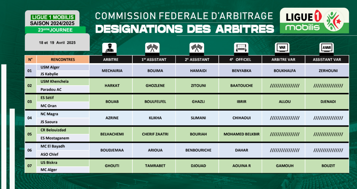 وسيدير الحكم الرئيسي مشايرية لقاء اتحاد العاصمة وشبيبة القبائل، بمساعدة بويمة وحمايدي، في حين سيتواجد في غرفة “الفار” كل من بوخالفة وزرهوني.