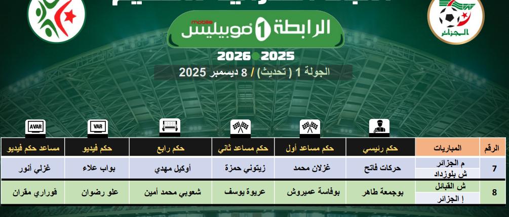 وسيدير الحكم الرئيسي فاتح حركات مباراة مولودية الجزائر وشباب بلوزداد، ويساعده كل من غزلان محمد وزيتوني حمزة.