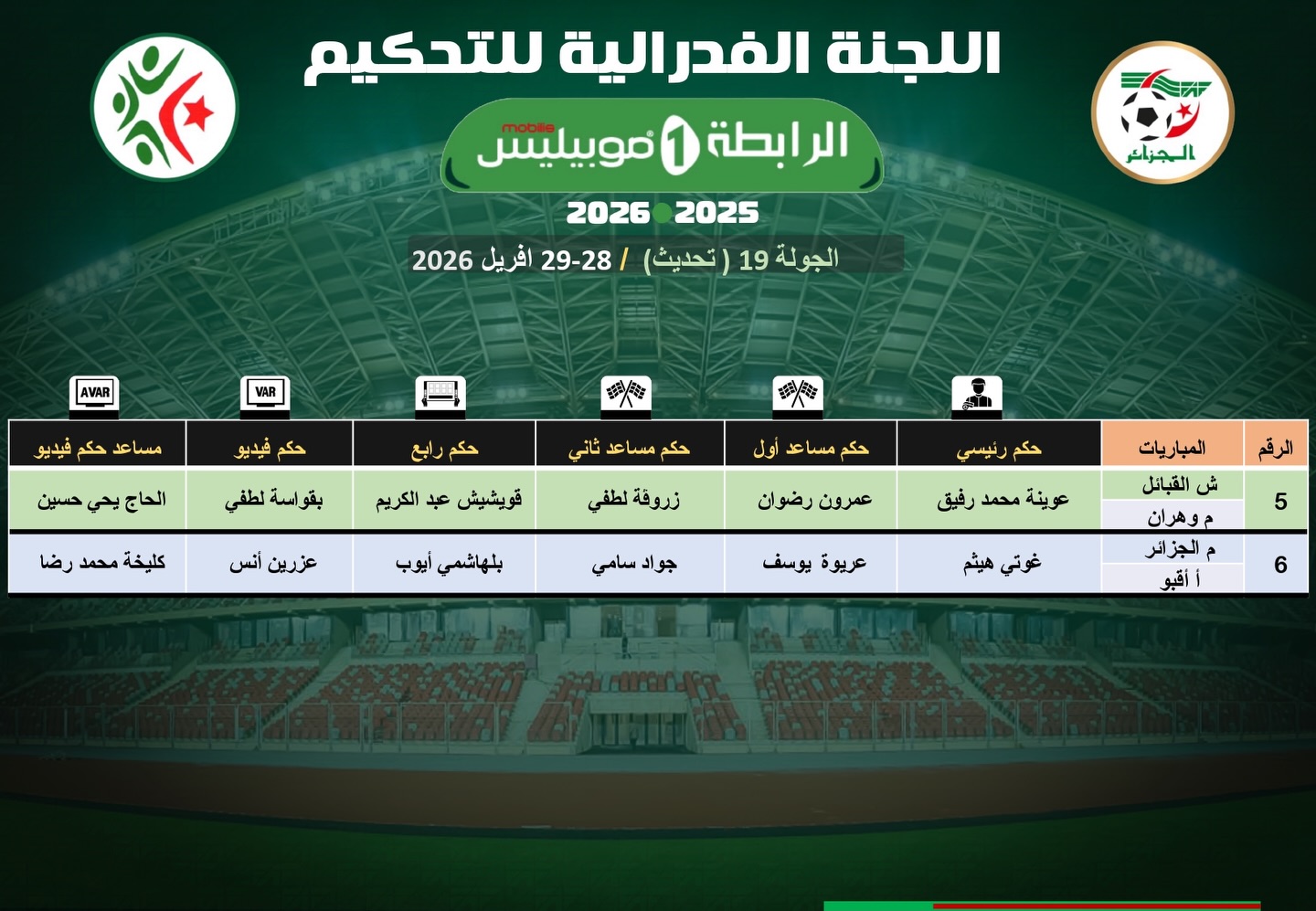 عيّنت اللجنة الفيدرالية للتحكيم حكام المبارتين المتأخرتين عن الجولة الـ19 من الرابطة المحترفة الأولى.