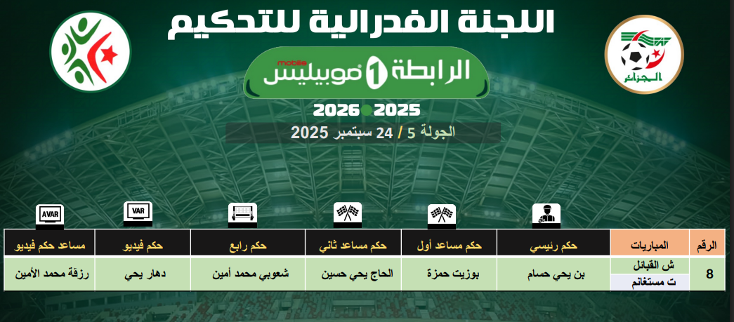 عيّنت اللجنة الفيدرالية للتحكيم حكام مباراة فريق شبيبة القبائل وضيفه ترجي مستغانم.