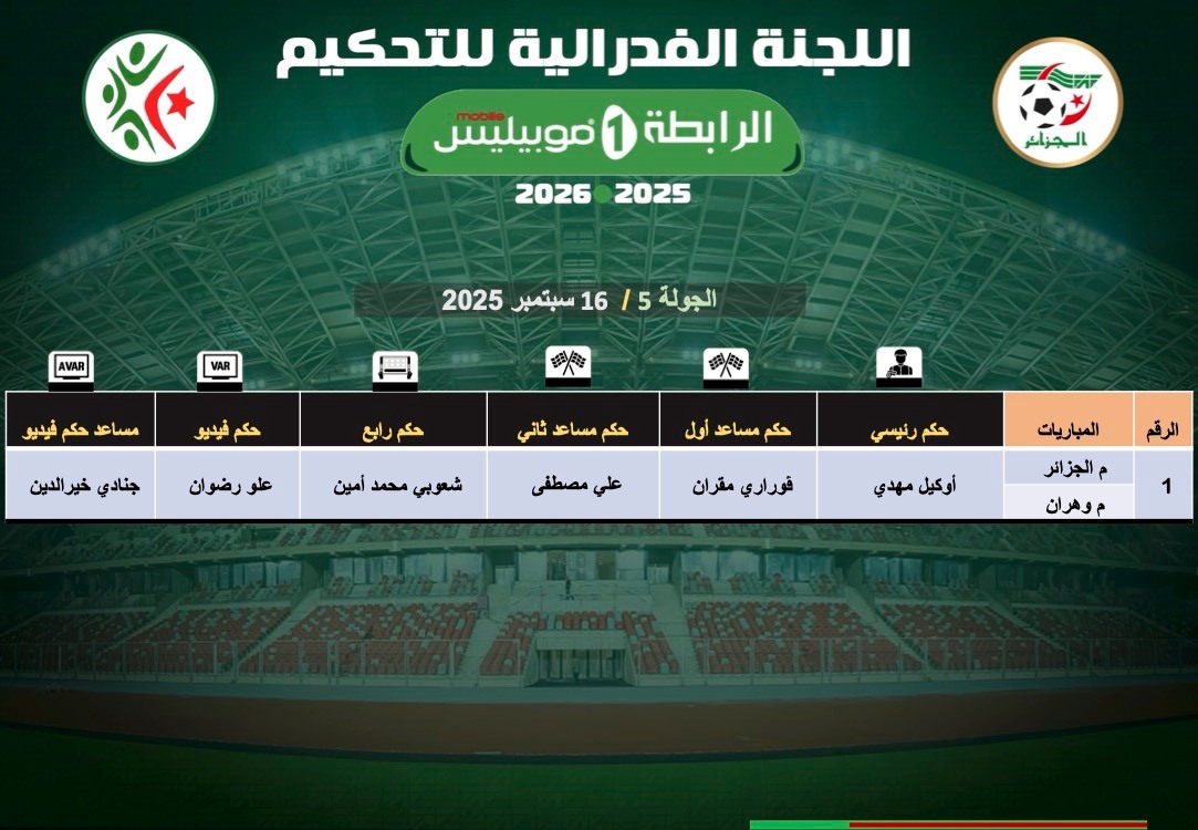 عيّنت اللجنة الفيدرالية للتحكيم حكام المباراة المقدمة عن الجولة الخامسة، والتي ستجمع بين مولودية الجزائر ومولودية وهران.