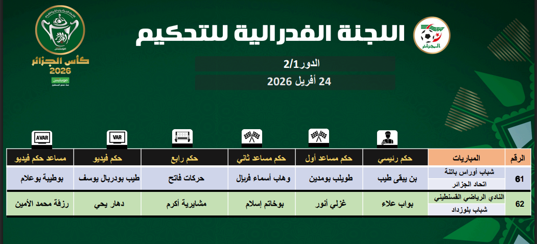 عيّنت اللجنة الفيدرالية للتحكيم حكام مبارتي نصف نهائي كأس الجزائر 2026 .