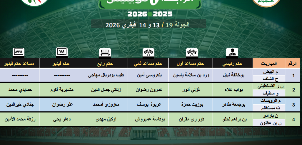 تعيين حكام مباريات الجولة الـ19 من الرابطة المحترفة الأولى