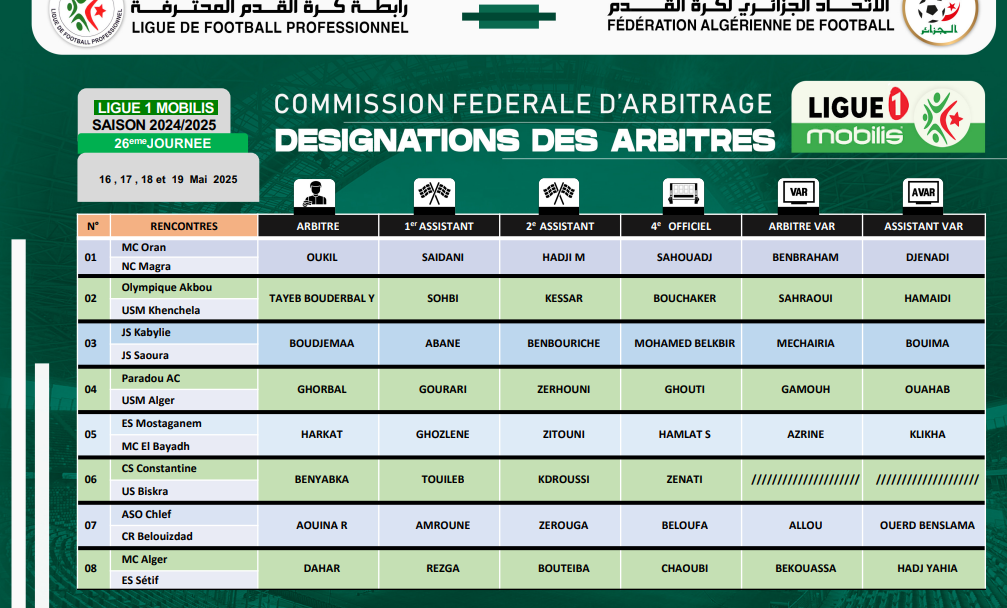 عيّنت اللجنة الفيدرالية للتحكيم، حكام مباريات الجولة الـ26 من الرابطة المحترفة الأولى.