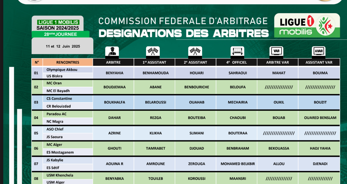 عيّنت اللجنة الفيدرالية للتحكيم، حكام مباريات الجولة الـ28 من الرابطة المحترفة الأولى.