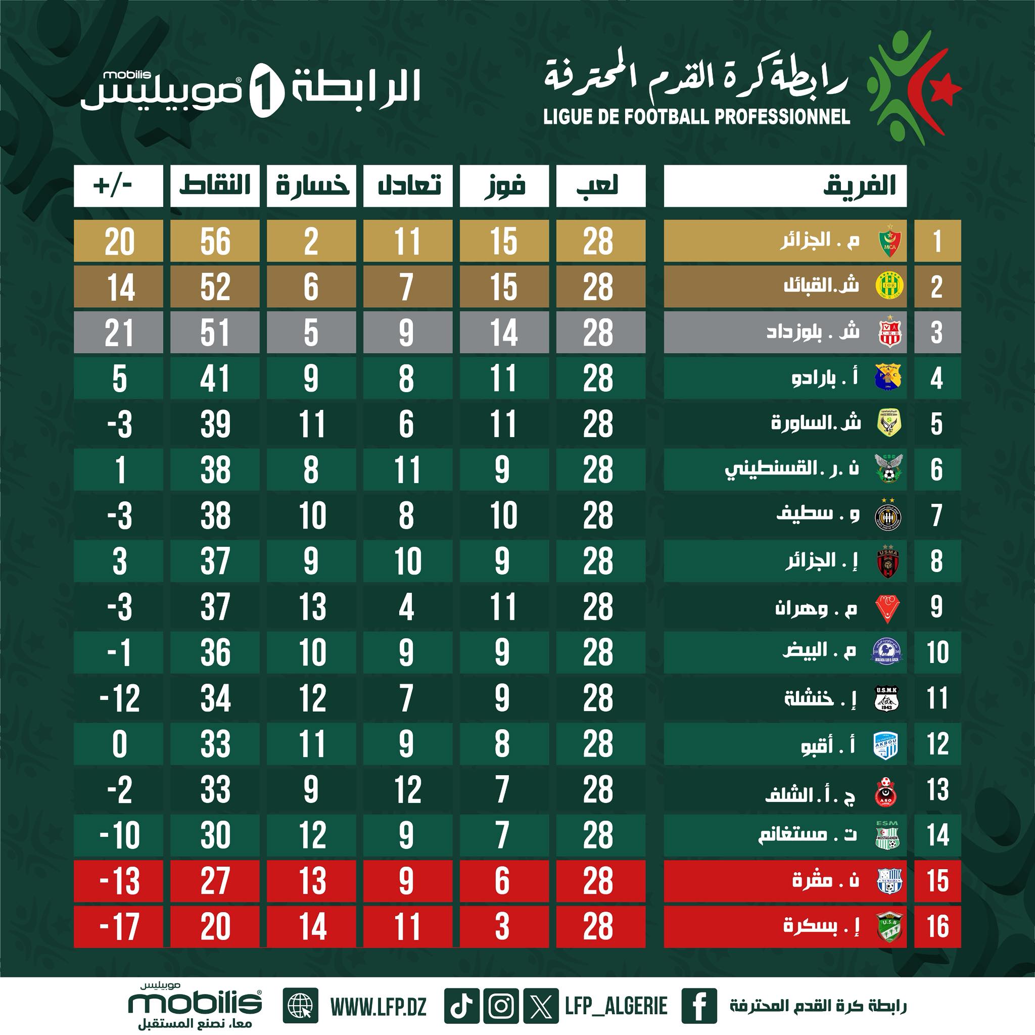 وقبل جولتين على إختتام الموسم 2024 -2025، يتصدر فريق مولودية الجزائر جدول ترتيب الرابطة الأولى برصيد56 نقطة بفارق 4 نقاط عن الوصيف شبيبة القبائل، و5 نقاط عن ثالث الترتيب شباب بلوزداد.