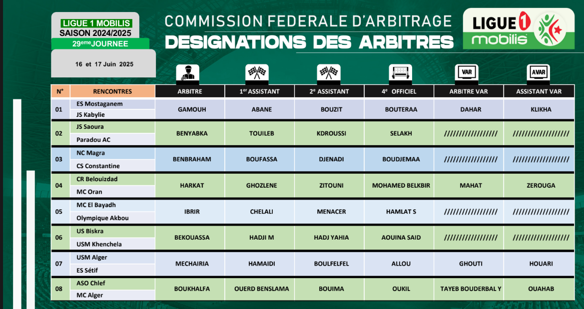 عيّنت اللجنة الفيدرالية للتحكيم حكام الجولة الـ29 من الرابطة المحترفة الأولى.