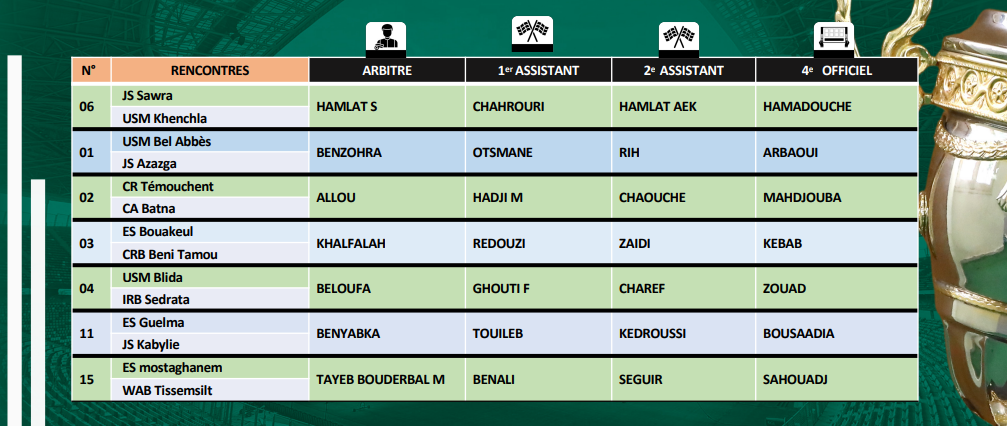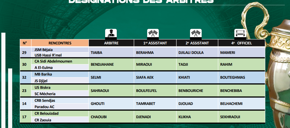 عيّنت اللجنة الفيدرالية للتحكيم، حكام مباريات الدور الثاني والثلاثين من منافسة كأس الجزائر.