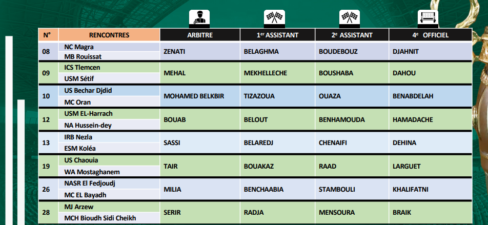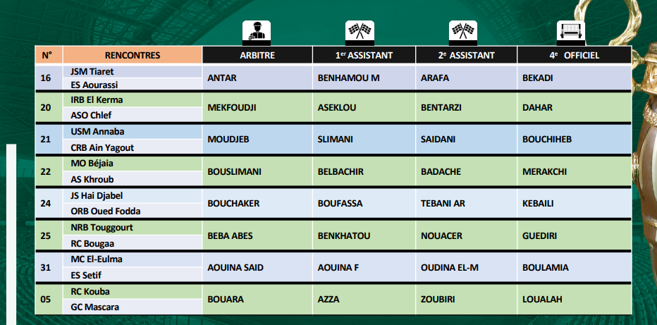 وسيدير الحكم بلكبير مباراة اتحاد بشار الجديد أمام مولودية وهران، في حين سيدير الحكم زناتي مباراة نجم مقرة ومستقبل الرويسات.