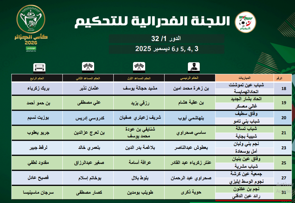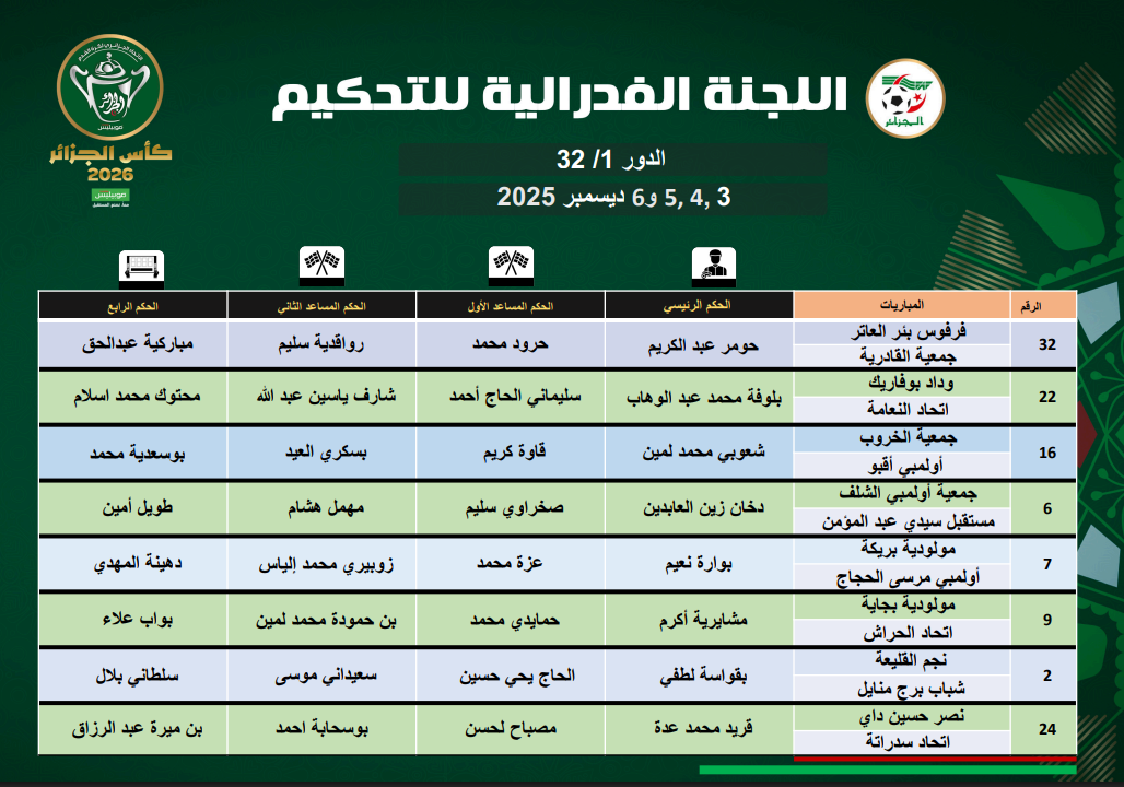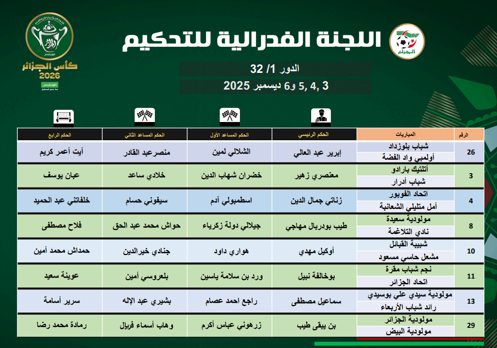 عيّنت اللجنة الفيدرالية للتحكيم حكام مباريات الدور الـ32 من منافسة كأس الجزائر 2025 -2026.