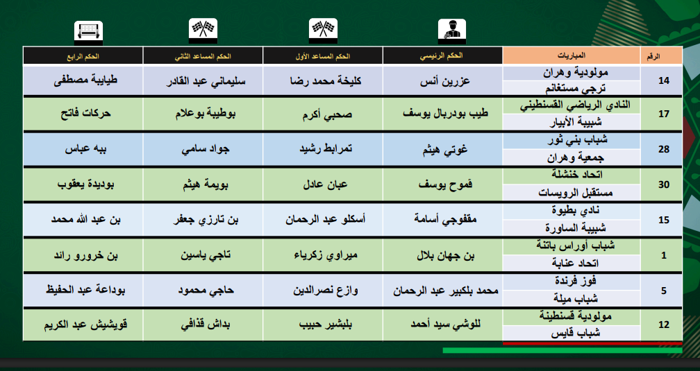 أما مباراة مولودية وهران وترجي مستغانم فسيديرها الحكم الرئيسي أنس عزرين.