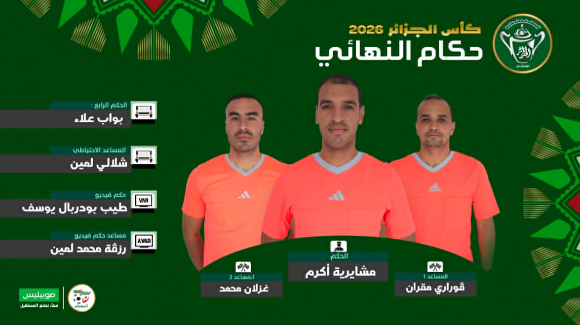 وأسندت مهمة إدارة النهائي، للحكم الرئيسي أكرم مشايرية، ويساعده كل من مقران قوراري ومحمد غزلان.