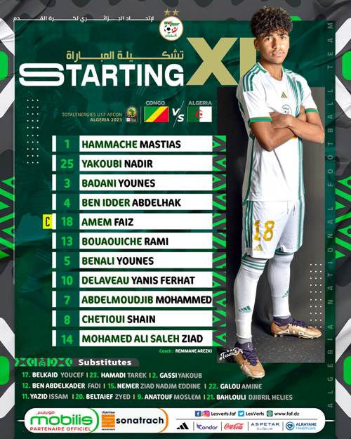 وتشكّلت قائمة اللاعبين الأساسيين لِأشبال “الخضر” أمام الكونغو برازافيل، كما تُبرزه اللائحة المُدرجة أدناه.