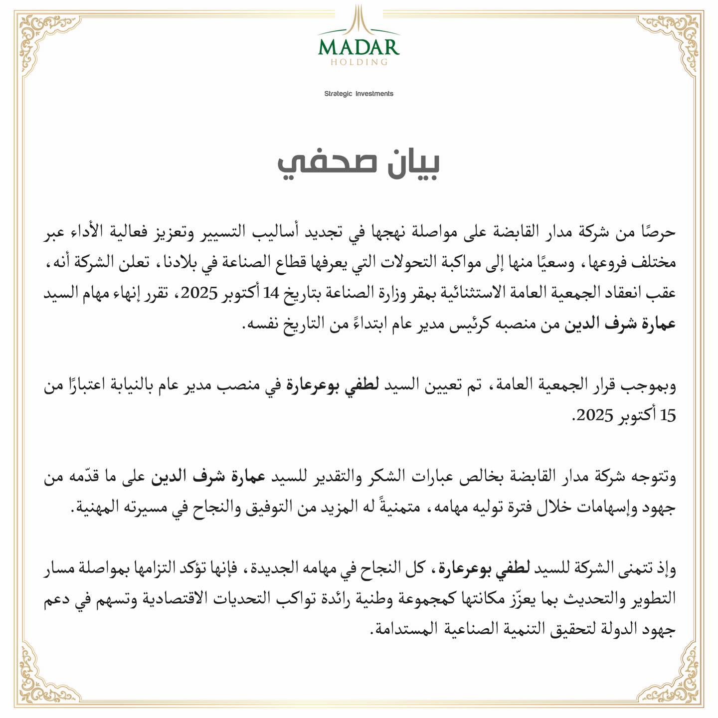 أعلنت شركة مدار القابضة عن إنهاء مهام عمارة شرف الدين من منصبه كرئيس مدير عام، وذلك عقب انعقاد الجمعية العامة الاستثنائية بمقر وزارة الصناعة بتاريخ 14 أكتوبر 2025.
