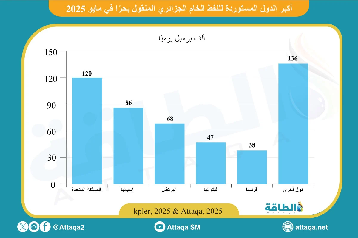 وعلى مستوى الأشهر الخمسة الأولى من 2025، تصدرت إسبانيا إجمالي واردات الخام الجزائري بـ84 ألف برميل يوميًا، تلتها فرنسا بـ67 ألفًا، ثم المملكة المتحدة بـ58 ألفًا يوميًا.