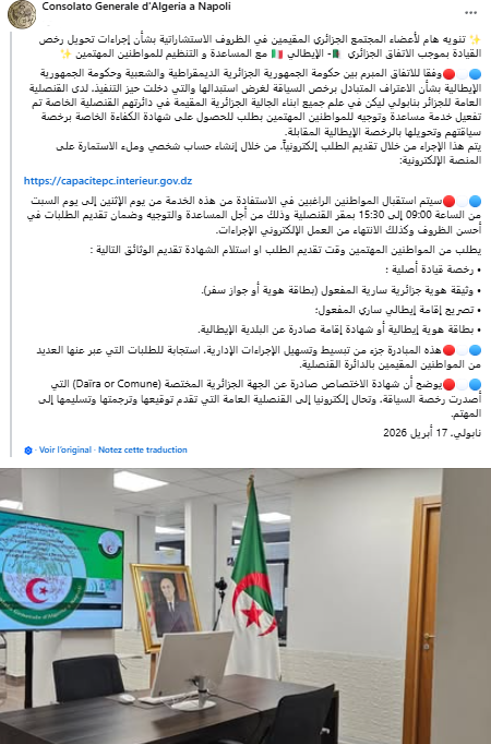 تم تفعيل خدمة مرافقة وتوجيه لفائدة أفراد الجالية الجزائرية الراغبين في تحويل رخص السياقة الجزائرية إلى نظيرتها الإيطالية، في إطار الاتفاق الثنائي بين الجزائر وإيطاليا المتعلق بالاعتراف المتبادل برخص السياقة لغرض الاستبدال، والذي دخل حيز التنفيذ بعد المصادقة عليه رسمياً.