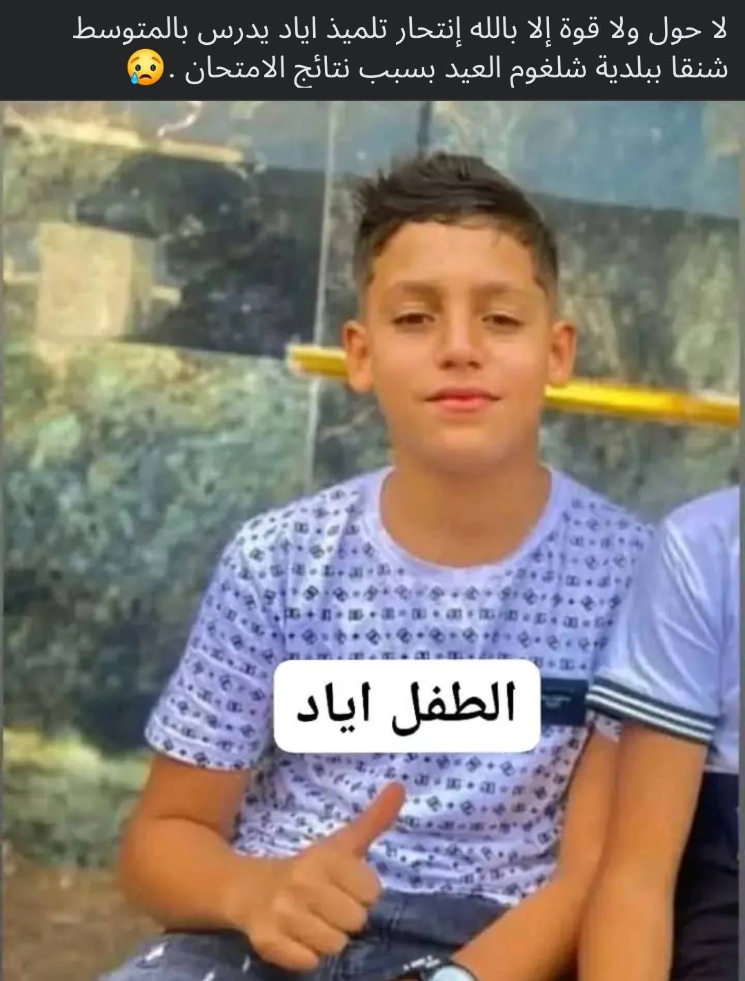 وكانت الصورة الأكثر انتشارا عبر منصات التواصل الاجتماعي، مساء الأربعاء، للتلميذ إياد من بلدية شلغوم العيد، بولاية ميلة، والذي أنهى حياته شنقا بسبب نتائج الامتحان، حسبما قال ناشرو صورته.