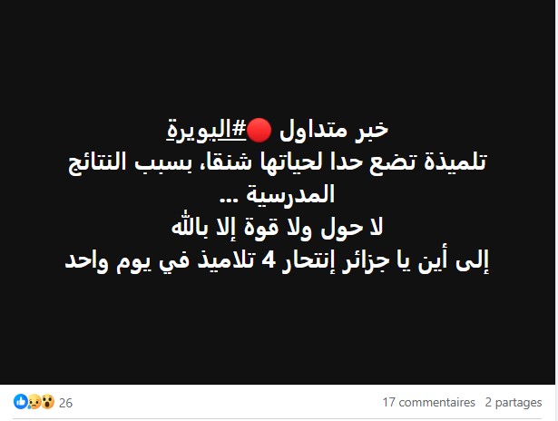 وتحدثت صفحات ولاية البويرة عن انتحار تلميذة بنفس الطريقة ولنفس الأسباب، الأمر الذي أثار عديد التساؤلات تصب في مجملها حول: “على من نلقي اللوم؟”.