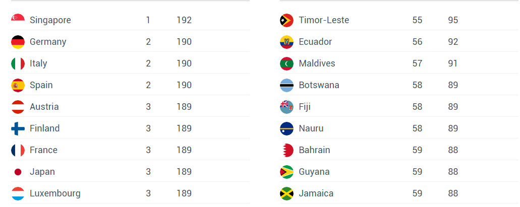وجاءت دول النمسا وفنلندا وفرنسا واليابان ولوكسمبورغ وكوريا الجنوبية والسويد في المرتبة الثالثة لأقوى جوازات السفر، ويمكن لحاملي جنسية هذه الدول السفر إلى 189 دولة بدون “فيزا”.