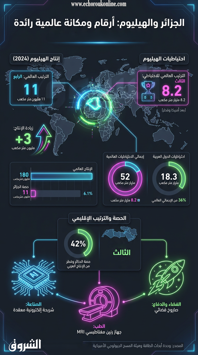 احتلت الجزائر المرتبة الرابعة عالميًا في إنتاج الهيليوم خلال عام 2024، بعد زيادة إنتاجها بمقدار 3 ملايين متر مكعب ليصل إلى 11 مليون متر مكعب، ضمن إجمالي عالمي بلغ 180 مليون متر مكعب.