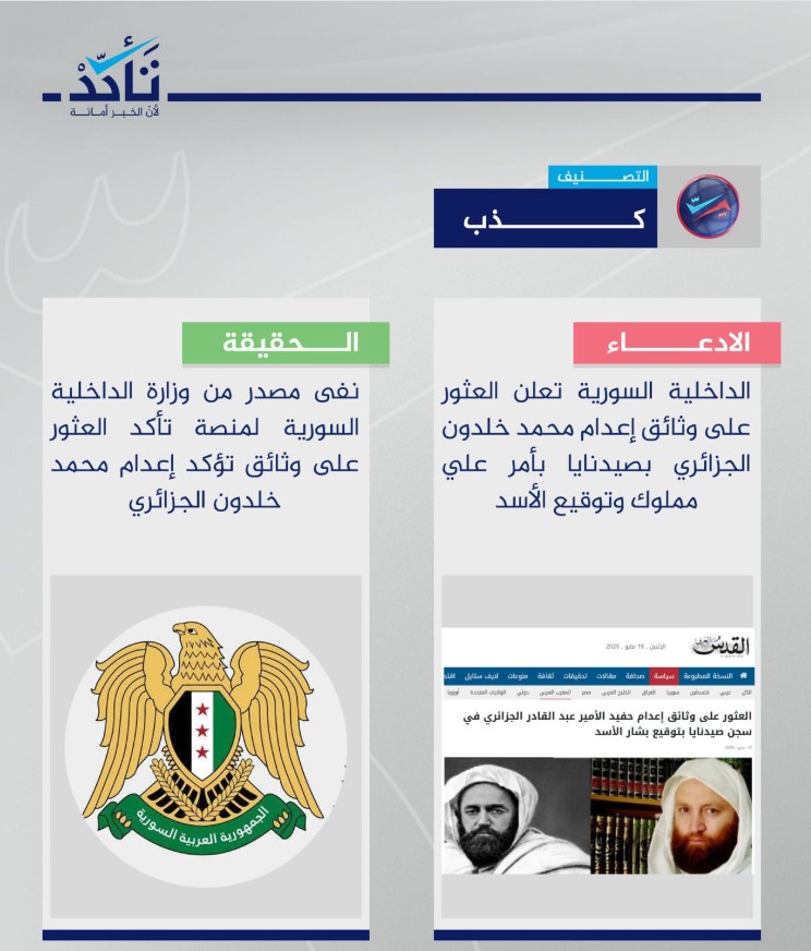 وأضافت أن مصدرا رسميا من وزارة الداخلية السورية نفى في تصريح للمنصة الإعلان عن العثور على وثائق تؤكد إعدام محمد خلدون الجزائري في سجن صيدنايا من قبل وزارة الداخلية.