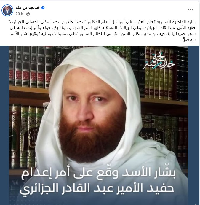وفي جانفي الماضي، عاد اسم الشيخ خلدون الحسني الجزائري، حفيد الأمير عبد القادر، للظهور مجددا في واجهة الأحداث، بعد العثور على وثيقة تثبت إعدام النظام السوري البائد له بسجن صيدنايا عام 2015.