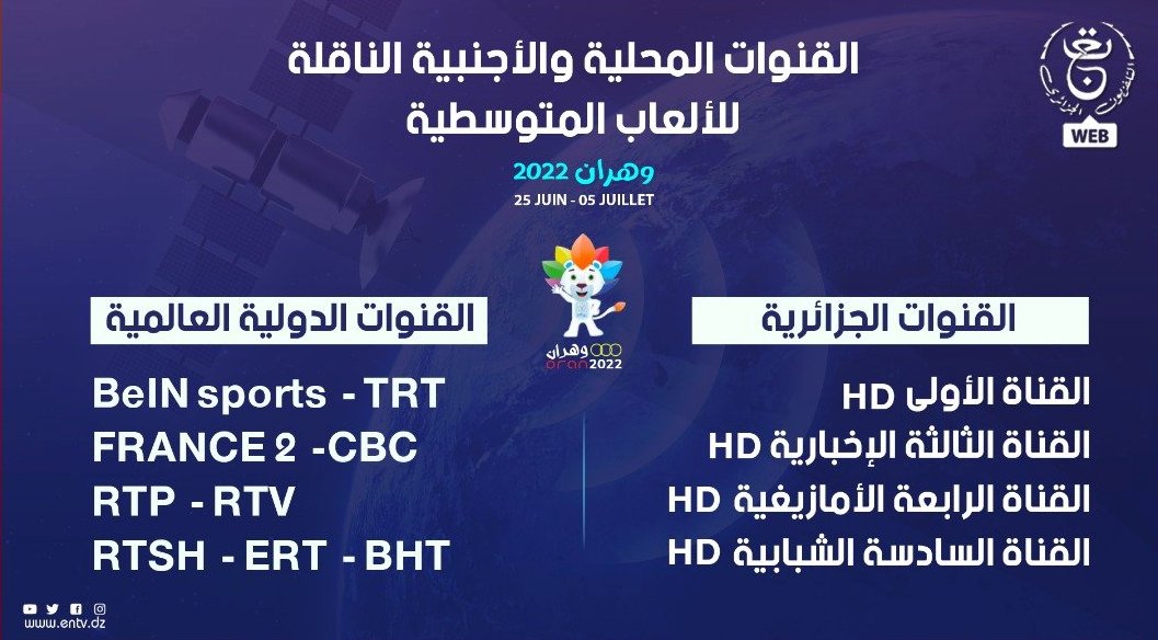 يُمكن للجمهور الجزائري مشاهدة فعّاليات ألعاب البحر المتوسط 2022، على الهواء مباشرة، عن طريق قنوات التلفزيون العمومي.