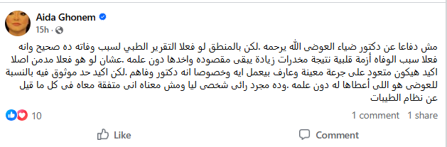 في ذات السياق فجرت الفنانة عايدة غنيم مفاجأة عن سبب الوفاة، وذلك من خلال منشور عبر حسابها الرسمي على فيسبوك قالت فيه: “مش دفاعا عن دكتور ضياء العوضى الله يرحمه، لكن بالمنطق لو فعلا التقرير الطبي لسبب وفاته ده صحيح وأنه فعلا سبب الوفاه أزمة قلبية نتيجة مخدرات زيادة يبقى مقصودة واخدها دون علمه”.