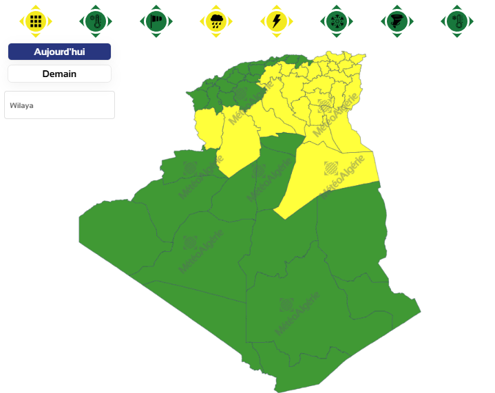 وحسب تنبيه للديوان الوطني للأرصاد الجوية من المستوى الأول باللون الأصفر على خريطة اليقظة، فإن الولايات المعنية بتساقط الأمطار والخلايا الرعدية بداية من الساعة التاسعة صباحا من اليوم الأحد إلى غاية الساعة التاسعة مساءً من نفس اليوم هي: سوق أهراس، ورقلة، الوادي، الأغواط، برج بوعريريج، تقرت، المسيلة، ميلة، أم البواقي، تبسة، قالمة، باتنة، عنابة، سطيف، الجلفة، قسنطينة، سكيكدة، البيض، المغير، جيجل، خنشلة، المدية، بسكرة، الطارف، النعامة، البويرة وأولاد جلال.